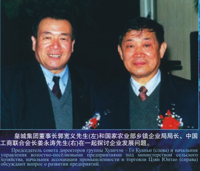 皇城集團董事長郭寬義先生(左)和國家農業部鄉鎮企業局局長、中國工商聯合會長姜永濤先生(右)在一起討論企業發展問題