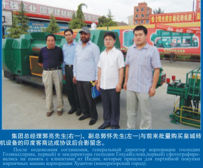 集團總經理郭亮先生(右一)、副總郭懷先生(左一)與前來批量購買磚機設備的印度客商達成協議后留影